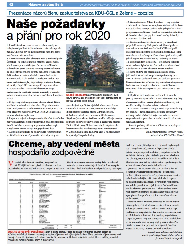 V jiných obcích mají schválený rozpočet na rok 2020 již na konci předchozího roku, ani na počátku ledna však zatím k našemu rozpočtu nemáme žádné informace. Lednové zastupitelstvo se konat nebude, na únorovém zřejmě dne 10.2. se nejspíše očekává hladké schválení. Předpokládáme, že se opět bude extrémně plýtvat penězi (ty jdou do vybraných soukromých rukou), namísto zlepšování chodu města, veřejných prostranství, zvýšených investic do školství i výstavby bytů, výstavby parkovacích domů pro občany např. u stadionu či na sídlišti atd. Kde je dlouhodobá vize, jak by město mělo vypadat za pár let a čeho chce současné vedení dosáhnout?!