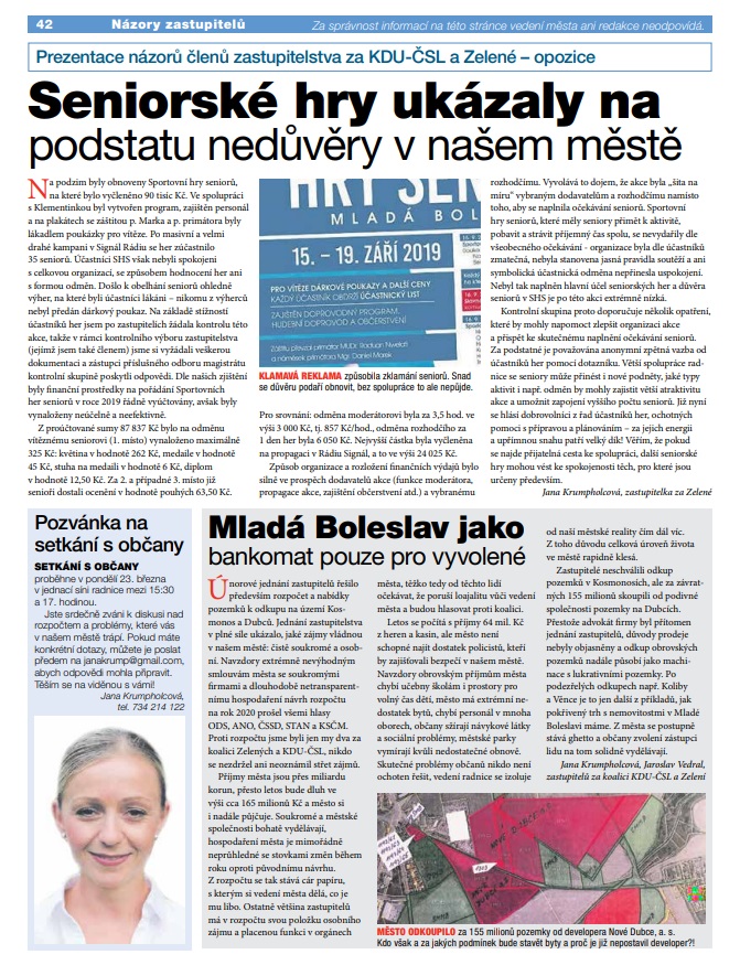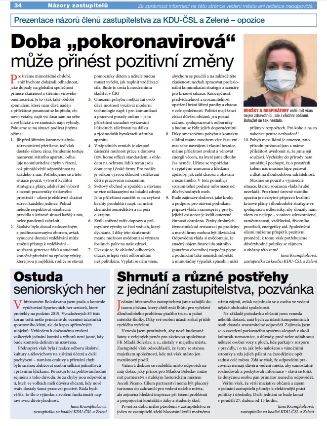 V březnovém Boleslavanu jsem psala o kontrole vyúčtování Sportovních her seniorů, které proběhly na podzim 2019. Vynaložených téměř 90 tisíc korun totiž nešlo primárně do ocenění účastníků sportovního klání, ale do kapes spřízněných subjektů. Vzhledem k dočasnému zrušení veškerých jednání komisí a výborů není jasné, kdy bude kontrola definitivně uzavřena. Překvapivá však byla i reakce Odboru školství, kultury a tělovýchovy na zjištěná účetní a další pochybení – namísto omluvy a přiznání chyb bylo snahou zlehčovat osobní selhání jednotlivců i právními kličkami. Považuji to za politováníhodné zejména z toho důvodu, že za chyby jsou odpovědní ti, kteří ve volbách měli důvěru občanů, kdy nové tváře dostaly šanci pracovat poctivě. Ráda bych věřila, že šlo o výjimku a zvolení funkcionáři napraví svou důvěryhodnost.