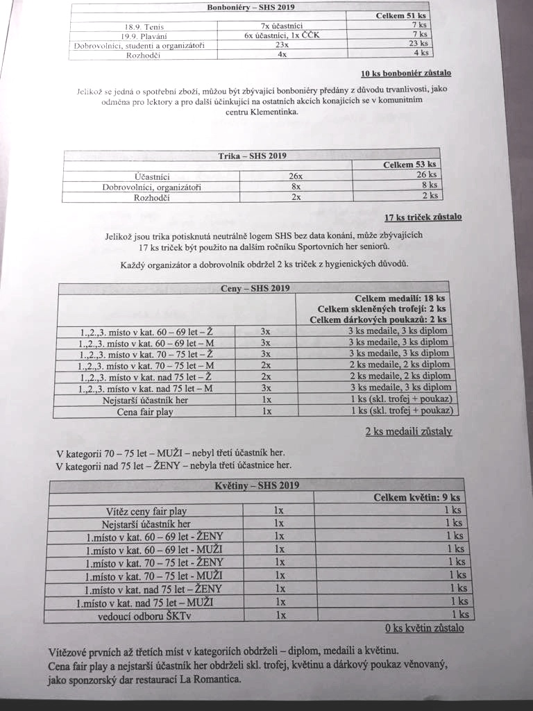 Na podzim byly obnoveny Sportovní hry seniorů, na které bylo vyčleněno 90 tisíc Kč. Ve spolupráci s Klementinkou byl vytvořen program, zajištěn personál a na plakátech se záštitou p. Marka a p. primátora byly lákadlem poukázky pro vítěze. Po masivní a velmi drahé kampani v Signál Rádiu se her zúčastnilo 35 seniorů. Účastníci SHS však nebyli spokojeni s celkovou organizací, se způsobem hodnocení her, ani s formou odměn. Došlo k obelhání seniorů ohledně výher, na které byli účastníci lákáni – nikomu z výherců nebyl předán dárkový poukaz. Na základě stížností účastníků her jsem po zastupitelích žádala kontrolu této akce, takže v rámci Kontrolního výboru Zastupitelstva (jejímž jsem také členem) jsme si vyžádali veškerou dokumentaci a zástupci příslušného odboru magistrátu kontrolní skupině poskytli odpovědi. Dle našich zjištění byly finanční prostředky na pořádání Sportovních her seniorů v roce 2019 řádně vyúčtovány, avšak byly vynaloženy neúčelně a neefektivně.