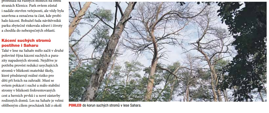 Článek v Boleslavanu 11/2020 na str. 12 „Kácení stromů postihlo Štěpánku i les na Sahaře“ sice uvádí důvody špatného zdravotního stavu některých stromů, avšak nezmiňuje žádná pochybení, např. kácení mladých a zdravých stromů.
