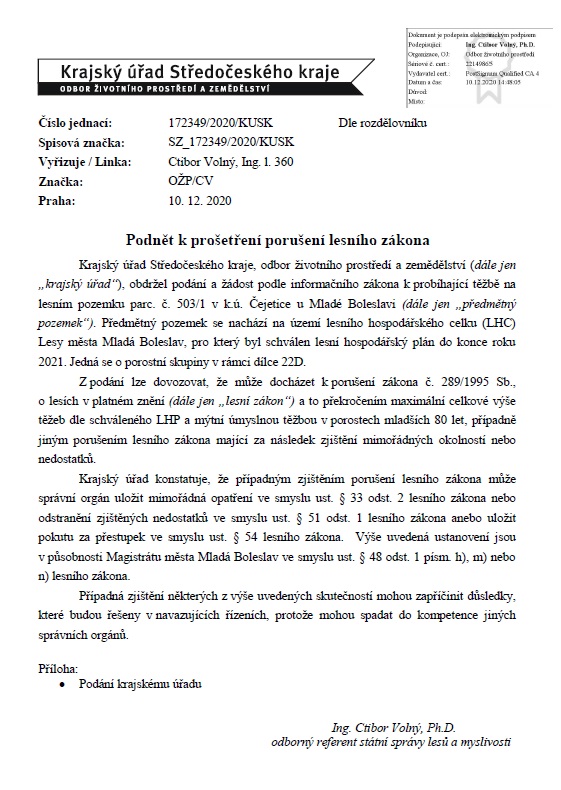 • Odbor životního prostředí a zemědělství Krajského úřadu Středočeského kraje dne 10.12.2020 postoupil Magistrátu města MB, odboru životního prostředí, podnět k prošetření porušení lesního zákona ve věci kácení lesa na Sahaře.