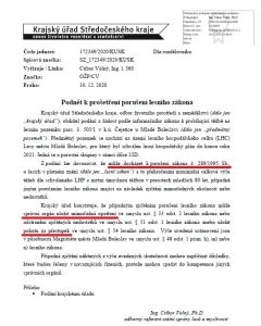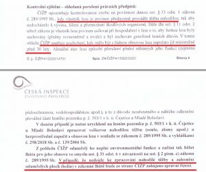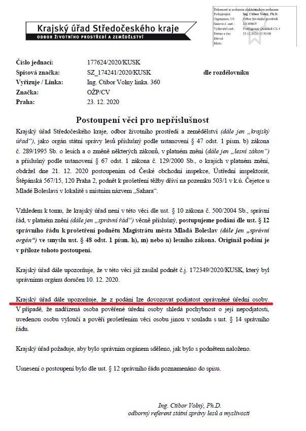 Krajský úřad Středočeského kraje v přípise „Podnět k prošetření porušení lesního zákona“ (10. 12. 2020) konstatoval, že může docházet k porušení lesního zákona, a to zejména nadlimitní těžbou či těžbou stromů mladších 80 let, popř. i k jiným porušením. V dalším přípise (s datem 23. 12. 2020) uvádí, že ve věci lze dovozovat možnou podjatost oprávněné úřední osoby (tj. úředníka státní správy lesů Luboše Kašíka).