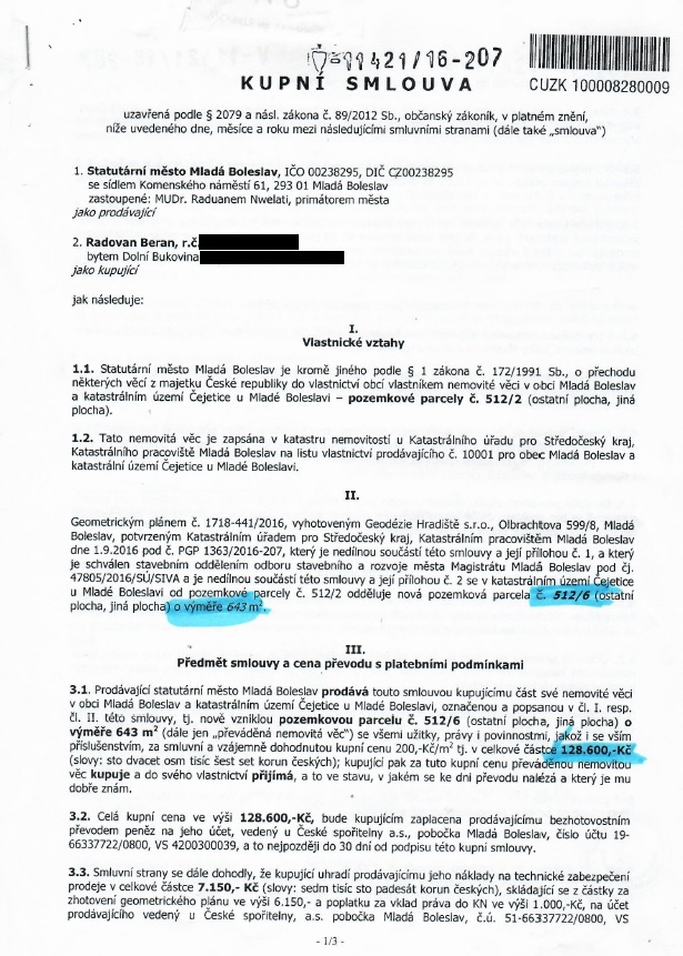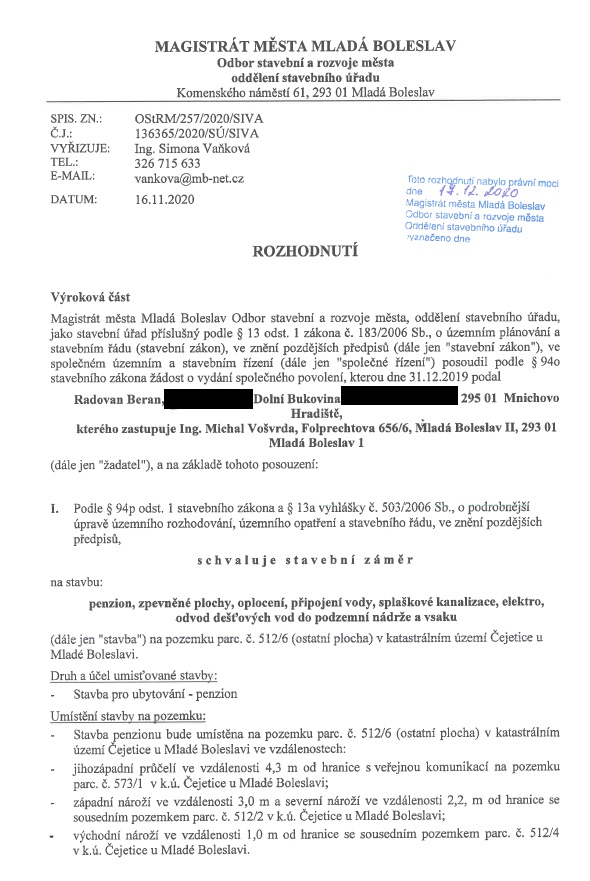 Kupující tedy zaplatil 200 Kč za 1 m2, avšak v listopadu 2020 vydal Magistrát města Mladá Boleslav rozhodnutí o schválení stavebního záměru na stavbu za účelem ubytování, konkrétně penzionu o 6 ubytovacích jednotkách (apartmány s jedním služebním bytem).