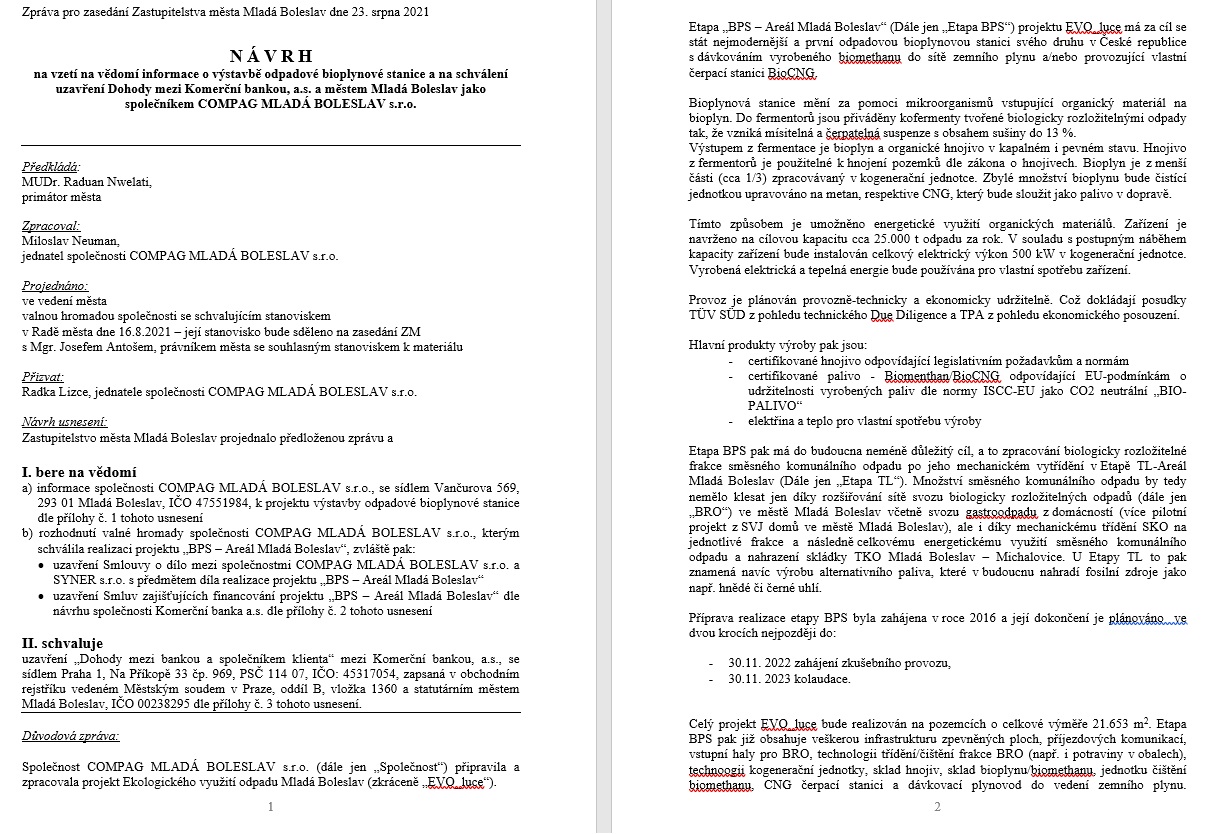 Na jednání zastupitelstva Mladé Boleslavi dne 23.8.2021 byla posvěcena výstavba bioplynové stanice, avšak celý projekt vzbuzuje mnoho pochybností. Zastupitelé na jednání pouze formálně schválili už podepsané dohody o investici ve výši 363 milionů Kč s nechvalně proslulou firmou SYNER, aniž by předem bylo cokoliv projednáváno se zastupiteli nebo dokonce s veřejností. Na výstavbu se váže i další obří úvěr, tedy nové dluhy pro město a jeho občany.