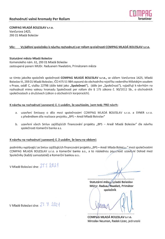 4. Jak je možné, že zasedání zastupitelstva v takto klíčovém projektu je až po Valné hromadě spol. COMPAG, která už o tom rozhodla, a po podpisu Smlouvy se SYNER? Nemělo by nejprve rozhodnout zastupitelstvo a teprve následně dát mandát/pověřit vedení města pro zastupování zájmů města na valné hromadě? Je usnesení valné hromady vůbec platné, jsou tedy v návaznosti na proces platné již podepsané smlouvy?! Je vůbec primátor oprávněn město zastupovat na valné hromadě?!