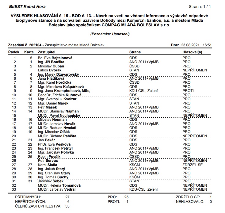 Diskusi k tématu bioplynky lze vyslechnout na zvukovém záznamu z jednání zastupitelstva pod bodem 13 a 33, avšak uvedené nejasnosti zůstávají. Celá záležitost působí velmi podezřelým až protizákonným dojmem a následky nesou hlavně zastupitelé a občané města. Výsledky hlasování jednotlivých zastupitelů přikládáme:
