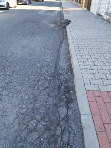 V ulici Prostřední pravidelně projíždějící autobusy poničily povrch ulice tak, že asfalt se pod vahou vozidla nahrnuje až na chodník.