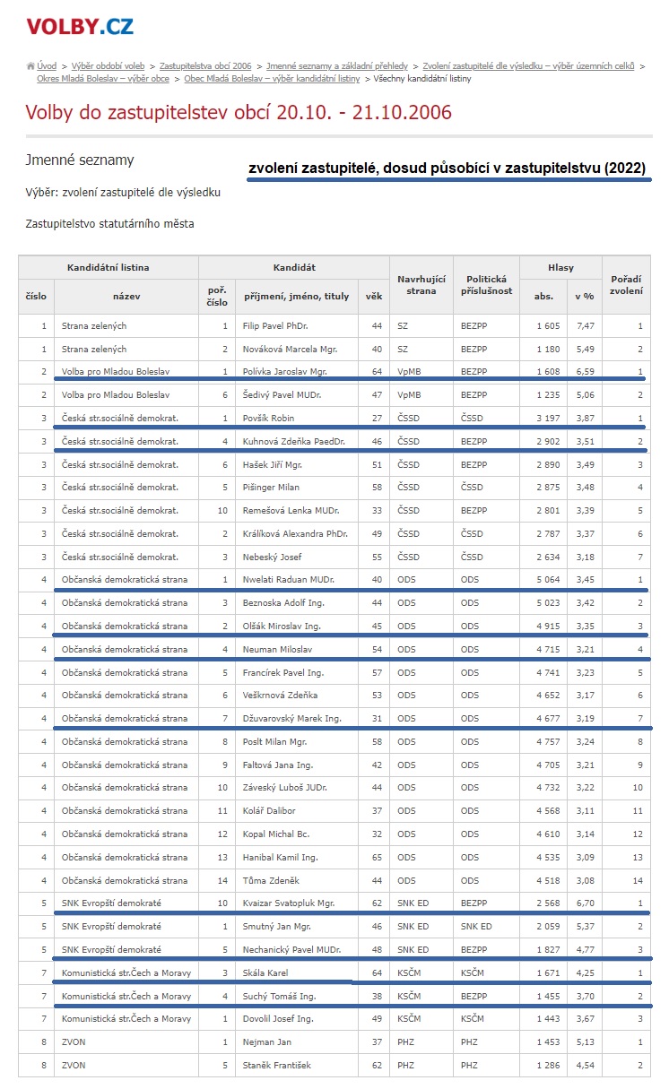 Celá třetina zastupitelstva v roce 2022 jsou stejná jména jako po volbách v roce 2006. Zásadní obměna ve vedení města se neodehrála… Kdo není v zastupitelstvu, může mít dosud jinou funkci – p. Zdeněk Tůma je jednatelem městské společnosti Lesy města Mladá Boleslav s.r.o.: