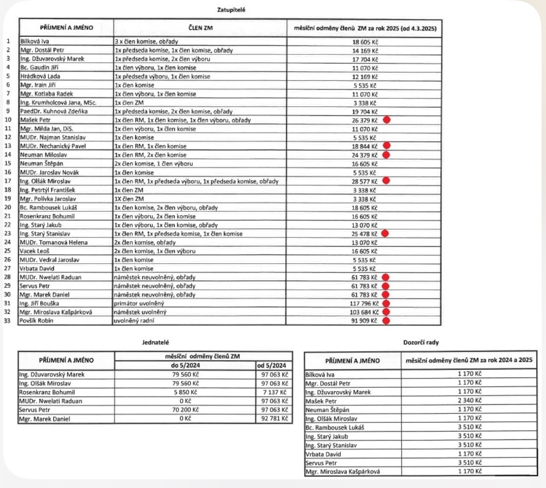 Základní odměny všech zastupitelů najdete v přiložené tabulce, radní jsou označeni červenou značkou: